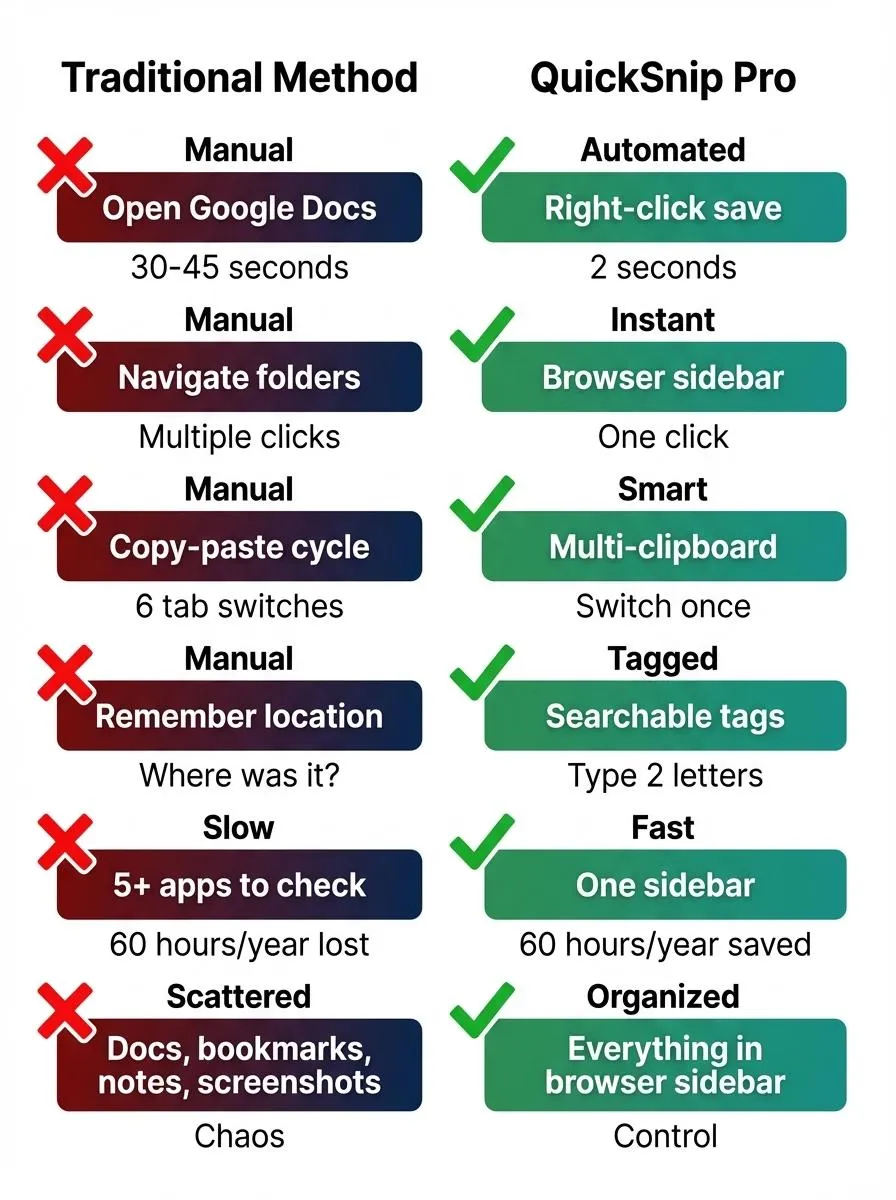 QuickSnap Pro ended that entirely. Everything's right there in Chrome - my pre-written outreach messages, email templates, prompts. A real time Saver!"